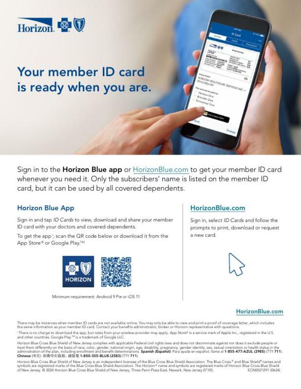 Digital Member ID Card - Member Flyer Digital Member ID Card - Member Flyer : This digital flyer provides an overview on how a member can access their member ID card through the Horizon Blue app and member portal.